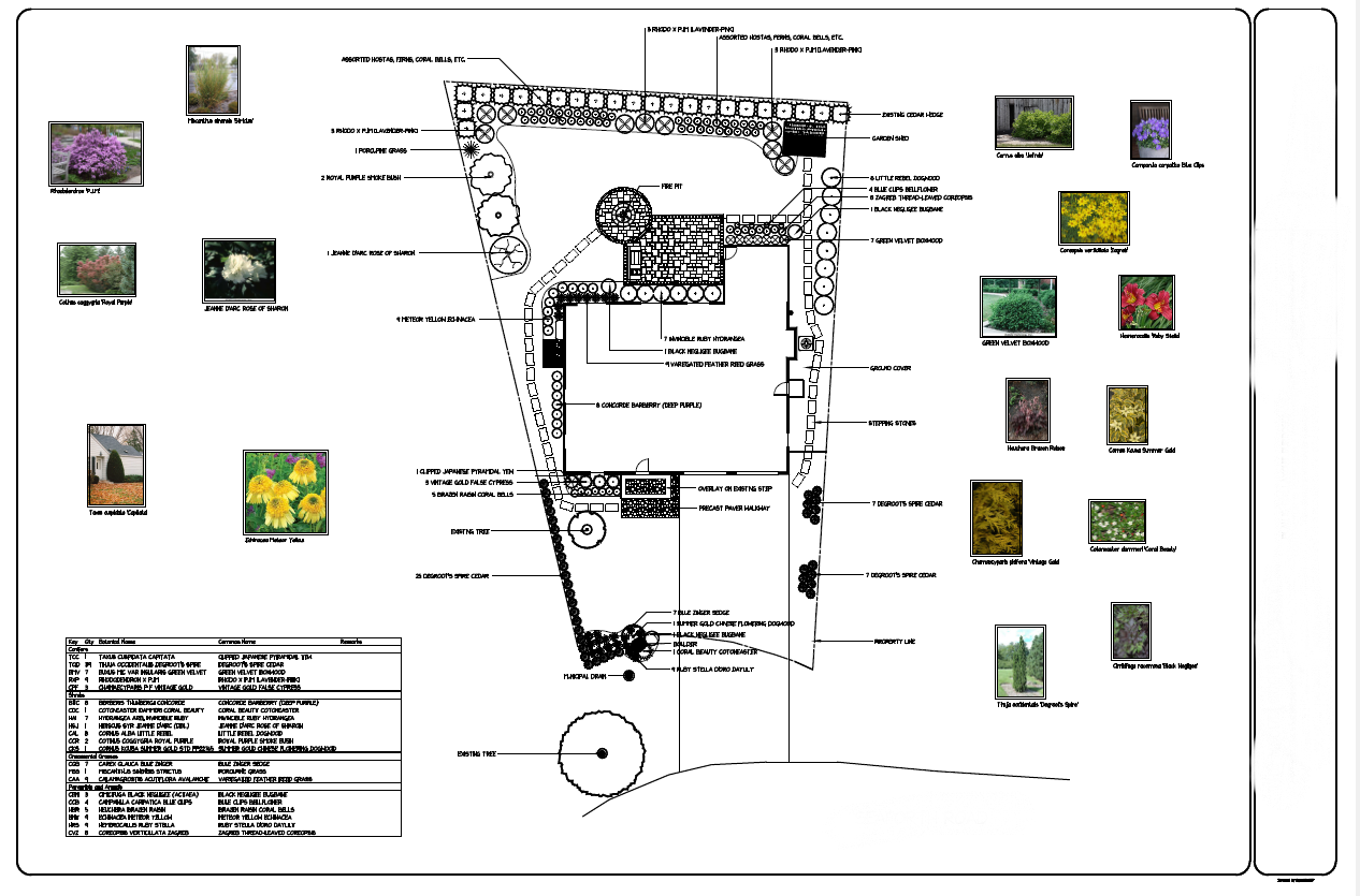 Our design process starts with a questionnaire to gather information and start the conversation. Once we receive the completed form, we will arrange a mutually convenient time to meet with you to discuss the project further and take measurements and photos. The finished design will be a labeled, scaled CAD drawing with pictures of plant materials and more.